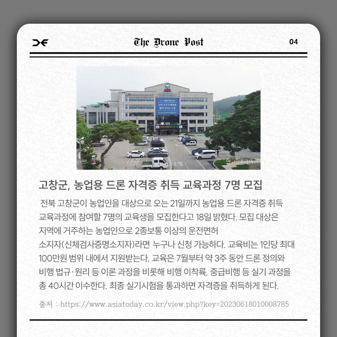 고창군, 농업용 드론 자격증 취득 교육과정 7명 모집